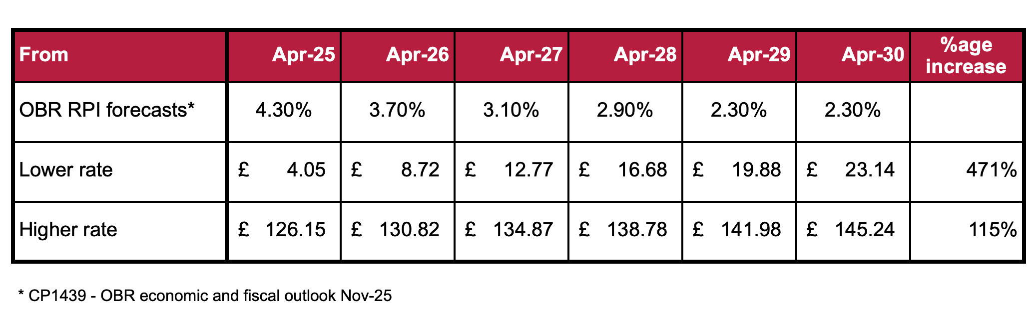 Landfill tax: the landfill tax standard rate will increase by RPI from 1st April 2026 taking the rate from £126.15 a tonne to £130.82 using OBR RPI forecasts, an increase of £4.67 per tonne which will also be applied to the current lower rate of £4.05 per tonne to a new rate of £8.72, representing a massive 115% increase in year 1 and over 470% increase over the term to 2030 based on the OBR RPI forecasts in the table below:
